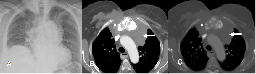 B: TAC axial en ventana de tejido y C: TAC axial en ventana ósea. Engrosamiento y alteración en la configuración del esternón por proceso neoplásico, con matriz de tipo condroide. (Flechas delgadas).  Adicionalmente hay masa de tejidos blandos que ocupa el mediastino. (Flechas gruesas).