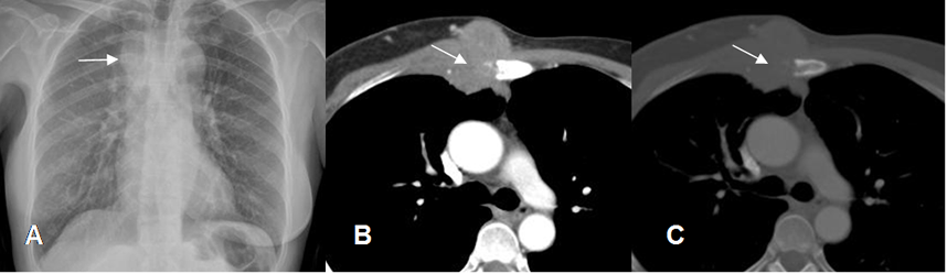A: Rx lateral. Masa de tejidos blandos, en la parte posterior del esternón.
