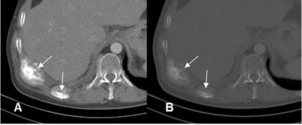 A: TAC en ventana de tejido y B: en ventana ósea. Lesiones expansivas en los arcos costales posteriores, de características blásticas, que corresponden a metástasis por neoplasia de mama.