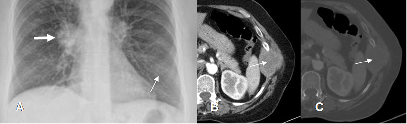 A: Rx PA. Pérdida en los bordes del arco costal posterior izquierdo. Prominencia del hilio derecho, por neoplasia pulmonar. (Flecha gruesa).