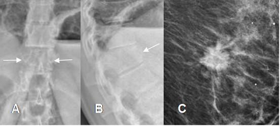 C: Mamografía: Lesión espiculada y densa, por neoplasia de mama.