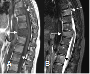 A: RM sagital en T1 y B: RM sagital en STIR. Igual paciente anterior. Lesiones focales en varias vértebras dorsolumbares, por enfermedad metastásica. En D11 hay compresión del saco dural.
