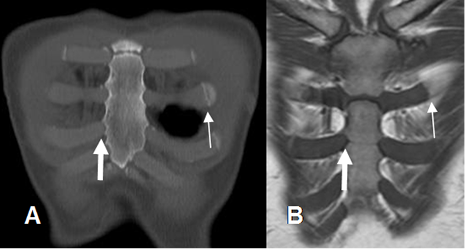 A: TAC reconstrucción coronal y B: RM coronal en T1. Articulaciones costocondrales (Flechas delgadas) y condroesternales normales. (Flechas gruesas).