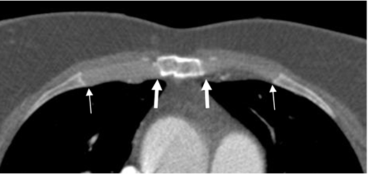 TAC axial. Articulaciones costocondrales (Flechas delgadas) y costoesternales normales (Flechas gruesas).