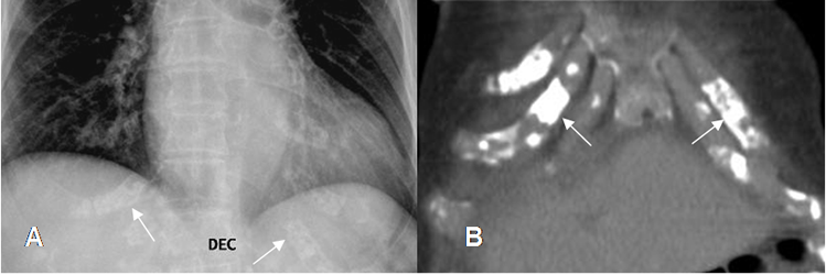 A: Rx PA y B: TAC reconstrucción coronal. Calcificación normal de los cartílagos costales, en las costillas falsas.