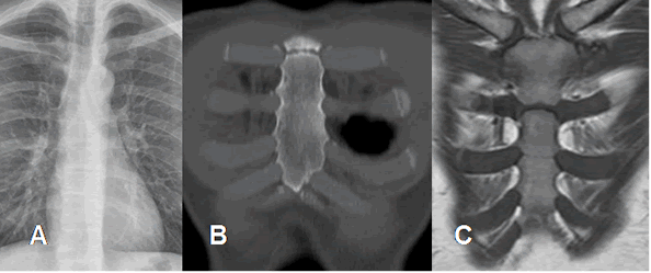 C: RM coronal en T1. Esternón hipointenso por predominio de medula osea roja.