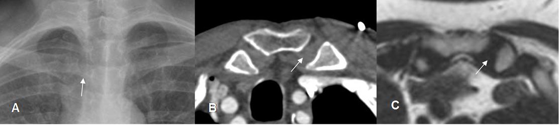 La TAC es la modalidad de elección para valorar este hueso y las articulaciones esternoclaviculares. La RM aporta información adicional sobre la medula osea y los tejidos blandos. (2). (Fig 14, 15 y 16).