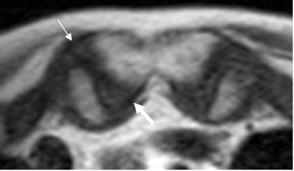 RM axial en T2. Ligamento esternoclavicular anterior (Flecha delgada) y esternoclavicular posterior (Flecha gruesa).