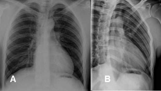 A: Rx PA y B: Rx oblicua. En la proyección oblicua se aprecian mejor las costillas, porque disminuye la superposición de estructuras.