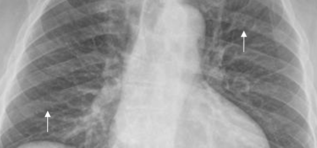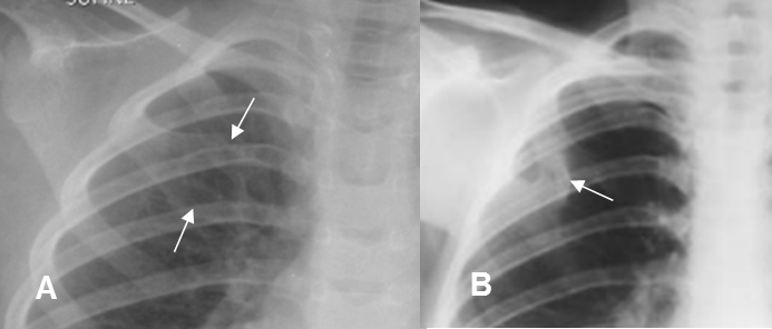 Rx PA. Pérdida de la nitidez en el borde inferior de las costillas, por la interposición del paquete vasculonervioso.