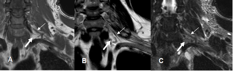 A: RM coronal en T1, B: RM coronal en T2 y C: RM coronal en STIR. Cojinete graso normal hiperintenso en T1 y T2 y que suprime en STIR (Flechas gruesas), que contiene las raíces nerviosas. (Flechas delgadas).