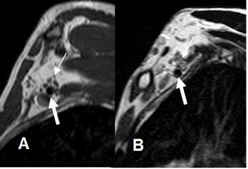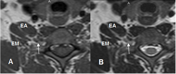 A: RM axial en T1 y B: RM axial en T2.  Raíces normales (Flechas delgadas), que emergen entre los músculos escaleno anterior (EA) y escaleno medio. (EM).