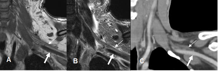 A: RM coronal en T1, B: RM coronal en T2 y C: TAC reconstrucción coronal. Raíces normales hipointensas, en la RM (Flechas delgadas), por encima de los vasos subclavios. (Flechas gruesas).