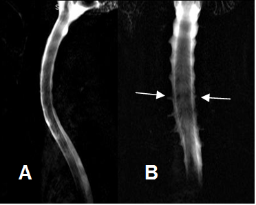 A: Mielografía por RM lateral y B: Mielografía por RM AP. Estudio normal, donde se aprecia la salida de las raíces.
