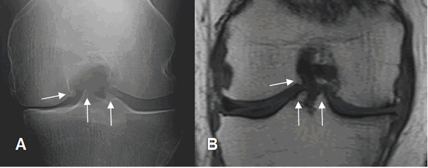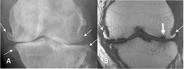 A: Rx AP y B: RM coronal en T1. Cambios degenerativos con formación de osteofitos (Flechas delgadas), disminución de los espacios femorotibiales, erosión de las superficies articulares y lesiones osteocondrales. (Flecha gruesa).