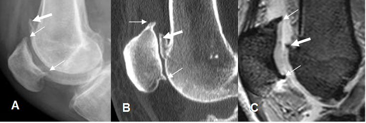 A: Rx lateral, B: TAC reconstrucción sagital y C: RM sagital en FFE. Presencia de osteofitos en el polo superior e inferior de la patela (Flechas delgadas) y la parte anterior del fémur distal. (Flecha gruesa).