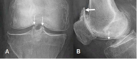 A: Rx AP y B: Rx lateral de rodilla. Formación de osteofitos centrales (Flecha delgada). En B existen cambios degenerativos en la articulación patelofemoral, con pérdida del espacio, esclerosis y osteofitos. (Flecha gruesa).