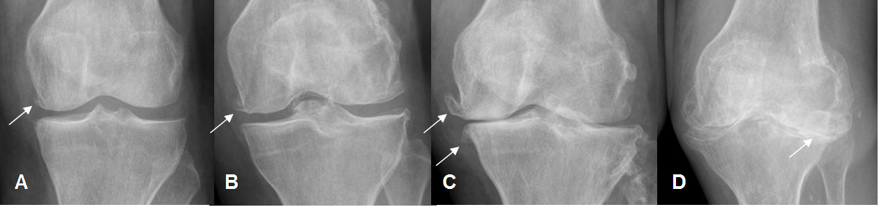 Lo característico es la formación de osteofitos marginales, disminución del espacio articular y esclerosis subcondral. En los casos avanzados se encuentran quistes subcondrales, derrame articular, degeneración o ruptura meniscal y lesiones ligamentarias. (42).