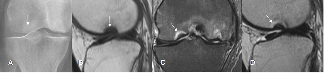 A: Rx AP. Pérdida de la configuración sobre el borde inferior, del cóndilo femoral medial.