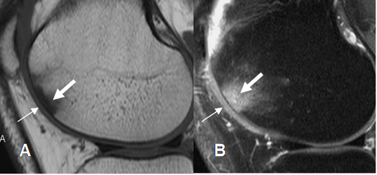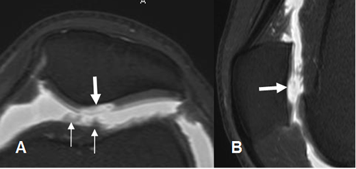 A: RM sagital en T2 y B: RM coronal en STIR. Defecto osteocondral, (Flechas delgadas)