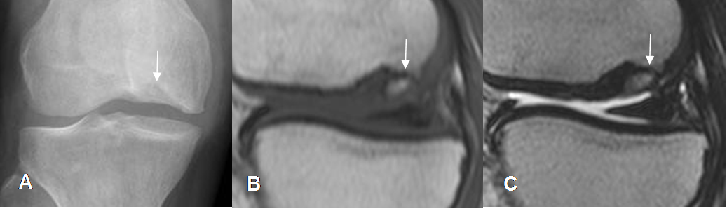 A: Rx AP. Area densa sobre el cóndilo femoral lateral.
