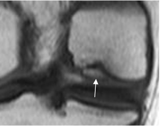 La RM es la modalidad de elección, para el estudio de las lesiones osteocondrales. El principal signo de inestabilidad de una lesión osteocondral, es la presencia de una imagen hiperintensa en T2, entre el fragmento y el hueso subyacente, que representa tejido de granulación. (49). (Fig 203).