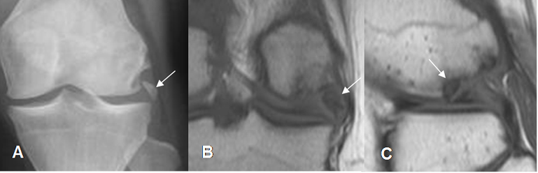 A: Rx AP y B: RM coronal en T1. Fragmento osteocondral desprendido, en la parte externa de la cavidad articular.