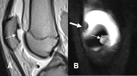 A: ArtroRM axial en STIR y B: ArtroRM sagital en T1. Defecto condral en el vértice (Flecha gruesa), con fragmentos libres sueltos. (Flechas delgadas).