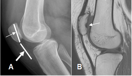 A: Rx lateral. Patela alta. La longitud de la patela (Flecha delgada), es menor que el espacio entre su polo inferior y el sitio de inserción. (Flecha gruesa).