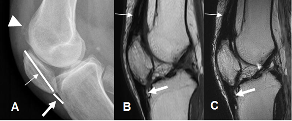 A: Rx lateral. Patela baja. La longitud de la patela (Flecha delgada), es mayor que el espacio entre su polo inferior y el sitio de inserción. (Flecha gruesa). Se aprecian calcificaciones anteriores, por tendinitis crónica. (Punta de flecha).