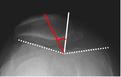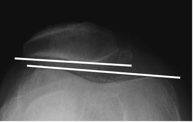 Rx tangencial de patela. Angulo patelofemoral anormal, con líneas paralelas, que indican desplazamiento lateral.