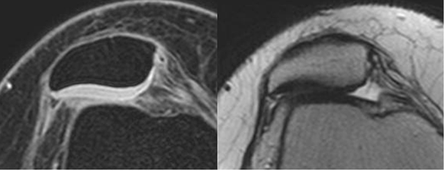 A: RM axial 3D T1 STIR y B: RM axial en T2. Desplazamiento lateral de la patela, sin alteración del cartílago articular.
