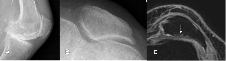 A: Rx lateral y B: Rx tangencial. Cambios degenerativos con disminución del espacio patelofemoral, esclerosis y formación de osteofitos.
