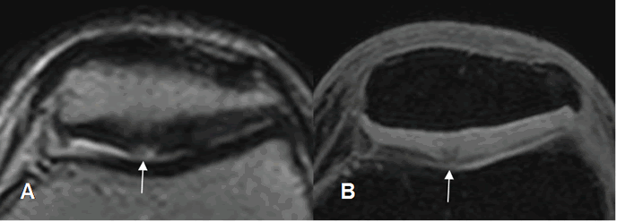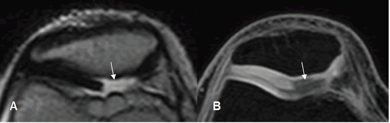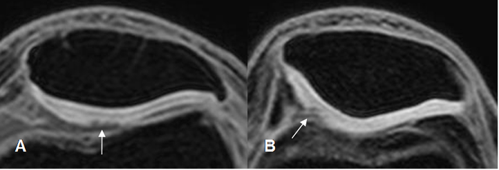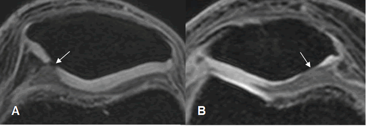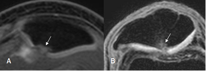 A y B: RM axial en 3D T1 STIR. Adelgazamiento del cartílago articular menor del 50%.