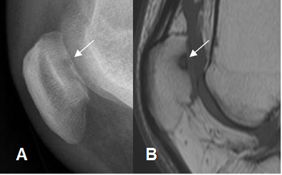 A: Rx lateral y B: RM sagital en T1. Lesión del cartílago articular, con defecto óseo en la patela, por condromalacia G 4.