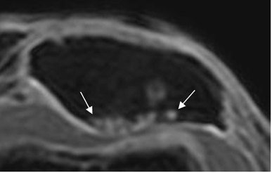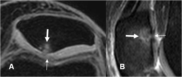A: RM 3D axial en T1 STIR y B: RM sagital en STIR. Adelgazamiento del cartílago articular a nivel del vértice, (Flechas delgadas) menor del 50%, con áreas hiperintensas en la patela, que corresponden a lesiones subcondrales. (Flechas gruesas).