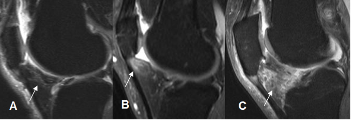 A, B y C: RM sagital en STIR. Zonas hiperintensas en la grasa infrapatelar, de grado variable y  progresivo, por cambios inflamatorios.