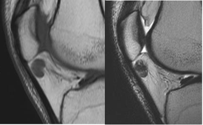 En la RM se encuentra aumento en la señal en T2, presencia de líquido y compresión del tendón patelar. En las fases crónicas aparece disminución de la señal por la fibrosis y formación de hemosiderina. (7). (Fig 154 y 155).