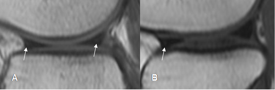 A y B: RM sagital en T1. Alteración en la parte medial del menisco, por ruptura radial.