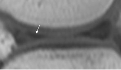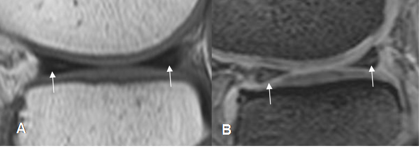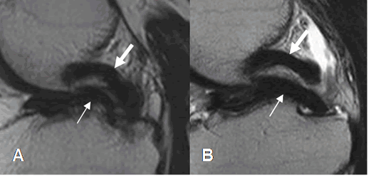 A: RM sagital en T1 y B: RM sagital en T2. Imagen en sentido oblicuo, hiperintensa en ambas secuencias, que se comunica con las superficies articulares superior e inferior, por ruptura.