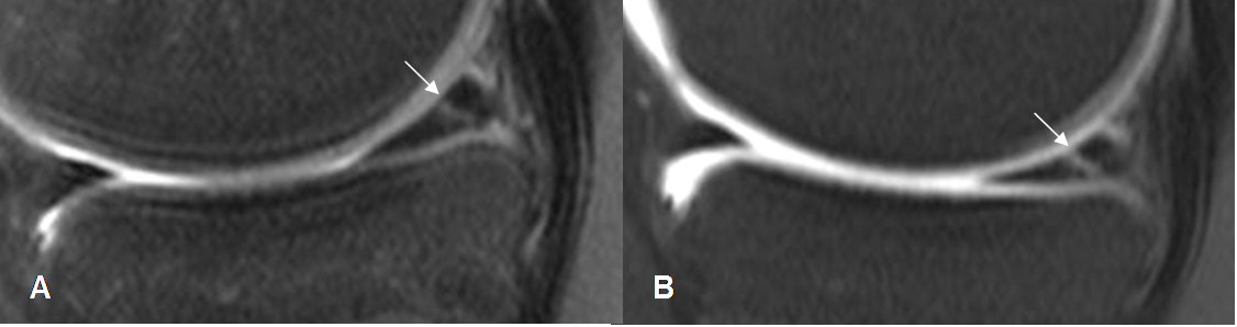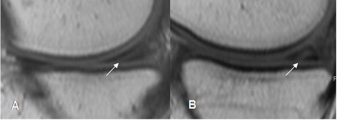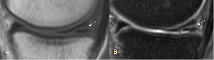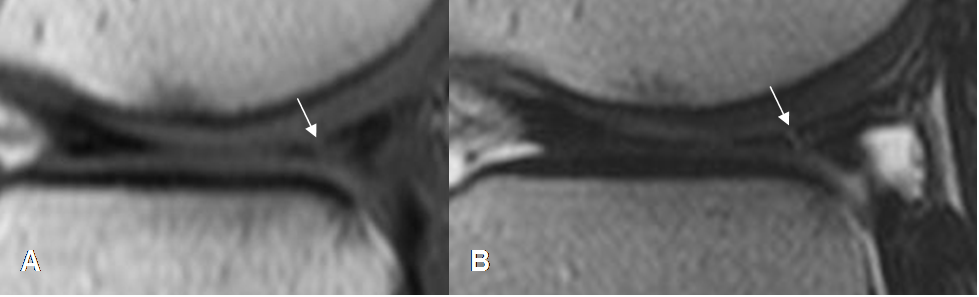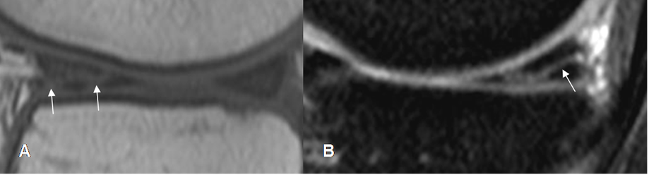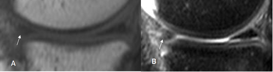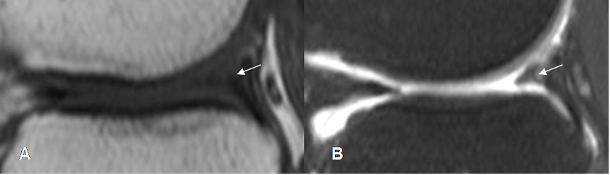 A: RM sagital en T1 y B: RM sagital en STIR. Imagen en sentido oblicuo, que se comunica con la superficie articular superior, por ruptura meniscal.