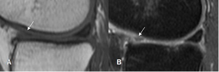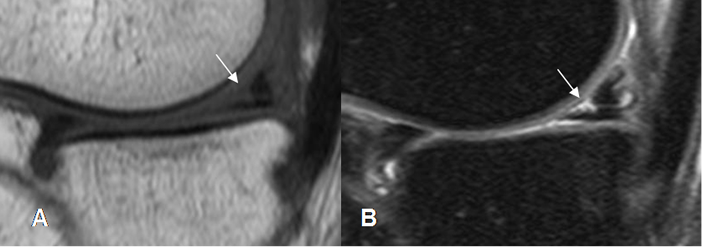 A: RM sagital en T1 y B: RM sagital en STIR. Imagen en sentido oblicuo, que se comunica con la superficie articular inferior, por ruptura meniscal.