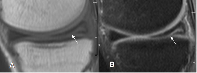 A: RM sagital en T1 y B: RM sagital en STIR. Imagen en sentido horizontal que se comunica el borde libre y la superficie articular inferior, por ruptura meniscal.
