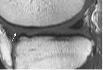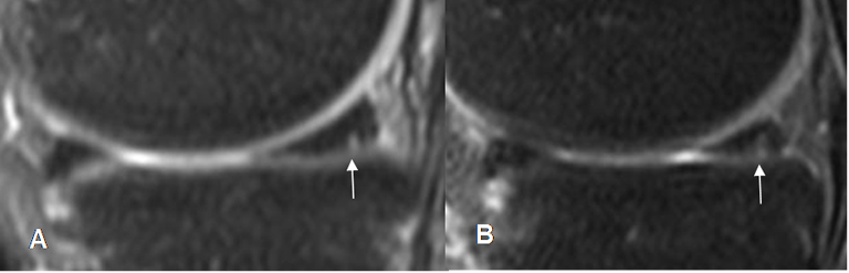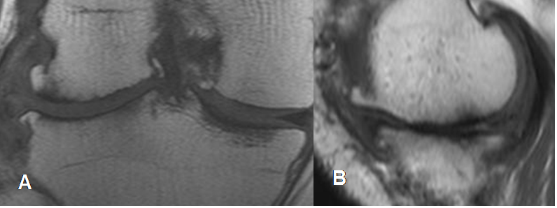 A: RM coronal y B: RM sagital en T1. Después de una menisectomía completa aparecen cambios degenerativos, como formación de osteofitos, erosión de las superficies articulares y disminución o pérdida del espacio.