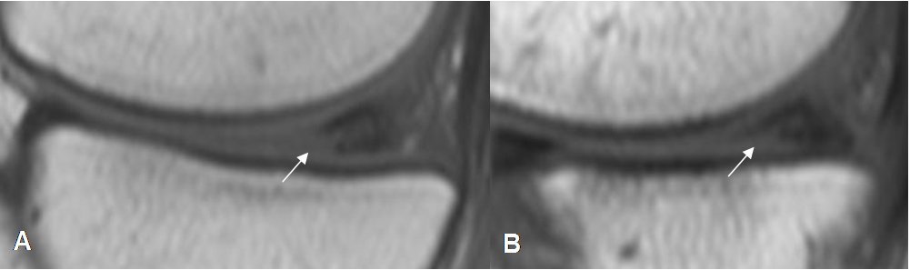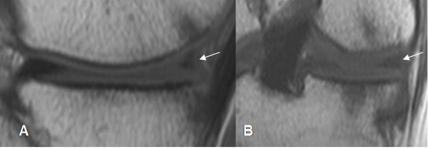 A y B: RM sagital en T1. Imágenes hiperintensas y en sentido oblicuo, sobre el cuerno posterior del menisco interno. La completa comunicación con el borde inferior, es difícil de determinar con certeza.
