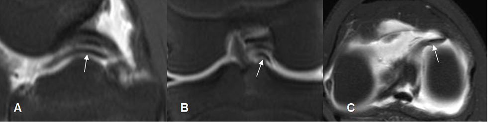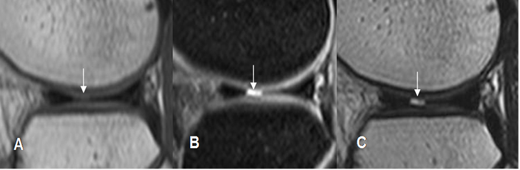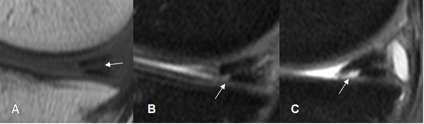 A: RM sagital en T1, B: RM sagital en STIR y C: RM sagital en T2. Defecto en la parte medial del cuerno anterior del menisco, por ruptura radial.