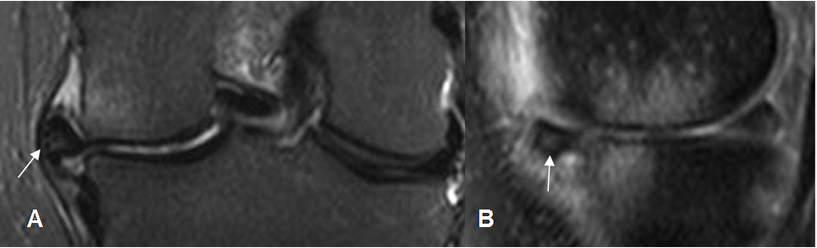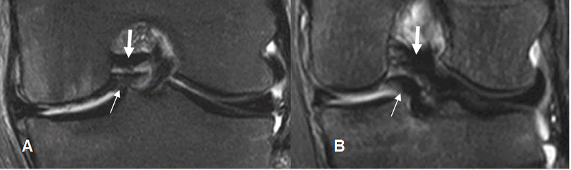 A y B: RM coronal en STIR. Fragmento meniscal ocupando la región intercondilea, por ruptura en asa de cubo. LCP normal (Flecha gruesa) y menisco desplazado (Flecha delgada).