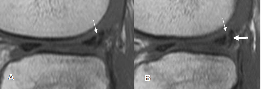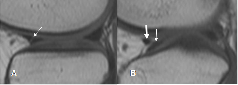 A y B: RM sagital en T1. En A hay imagen en sentido oblicuo en el cuerno anterior, que se comunica con la superficie articular superior, sugestiva de ruptura meniscal. En el corte sucesivo B, se aprecia que la imagen está compuesta por el cuerno anterior del menisco (Flecha delgada) y el ligamento transverso (Flecha gruesa) y no corresponde a ruptura.
