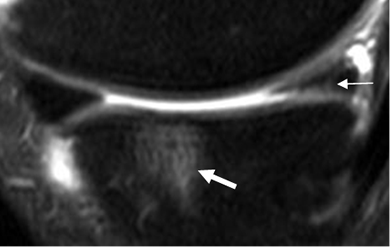 ArtroRM sagital en STIR. Cuerno posterior mas pequeño y con imagen hiperintensa en la parte inferior, que corresponde a sutura. (Flecha delgada). No hay signos de re-ruptura. Adicionalmente se aprecia contusión del platillo tibial, que puede explicar los síntomas. (Flecha gruesa).