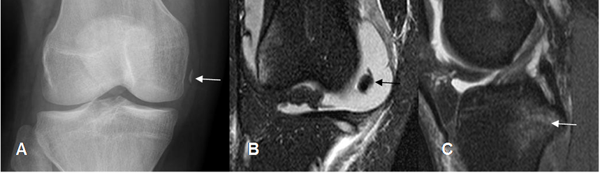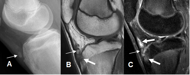 A: Rx lateral, B: RM sagital en T1 y C: RM sagital en STIR. Fragmentación de la espina tibial anterior. (Flechas delgadas). En las imágenes de RM hay cambios inflamatorios en la parte anterior de la tibia y la grasa de hoffa. (Flechas gruesas).